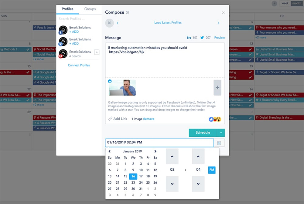 You can compose and schedule your posts to your Facebook, Twitter, LinkedIn, Pinterest and Instagram pages. In addition, you can monitor all your social media pages and engage with your followers across all your profiles from a central feed by interacting with all your likes, comments, direct messages, shares, and mentions across all your social media channels and profiles.